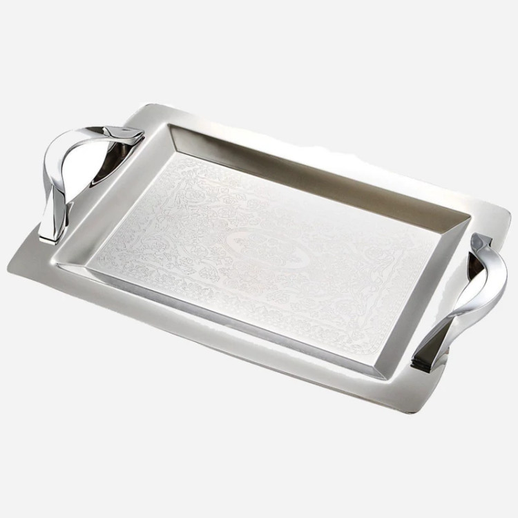 جنس: استیل شکل: مستطیل با گوشههای گرد دستهها: دو دستهی فلزی در دو طرف سینی طرح: دارای طرحهای برجسته و منبتکاری شده روی سطح کاربرد: مناسب برای سرو انواع غذا، نوشیدنی و سایر وسایل کوچک